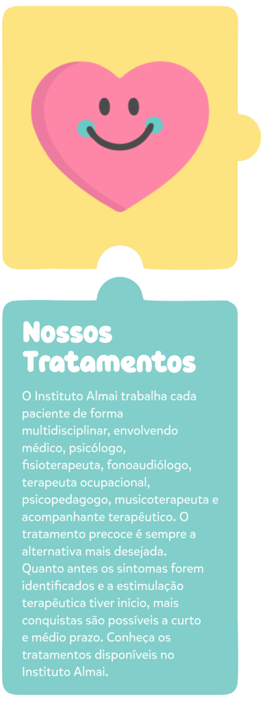 O Instituto Almai trabalha cada paciente de forma multidisciplinar, envolvendo médico, psicólogo, fisioterapeuta, fonoaudiólogo, terapeuta ocupacional, psicopedagogo, musicoterapeuta e acompanhante terapêutico. O tratamento precoce é sempre a alternativa mais desejada. Quanto antes os sintomas forem identificados e a estimulação terapêutica tiver início, mais conquistas são possíveis a curto e médio prazo. Conheça os tratamentos disponíveis no Instituto Almai.